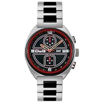 D&G Dolce & Gabbana DW0303 White numbers and indices, Analog date display, Polished stainless steel black ion plated bezel, Polished stainless steel silver-tone case, crown, selector buttons and screw-in caseback, 50 meters/165 feet water resistant Mineral crystal; Brushed and polished stainless steel case and bracelet Chronograph functions with 60 second and 60 minute subdials; date function ...